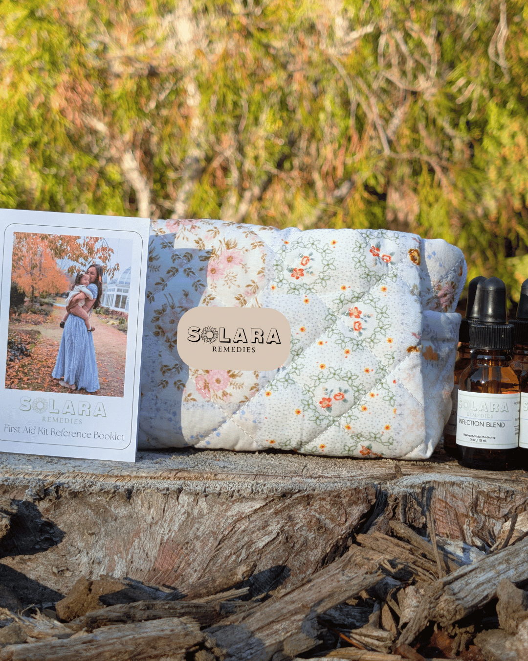 Our signature Solara Remedies bag, the First Aid Kit Reference Booklet, and 10 of our proprietary homeopathic blends.